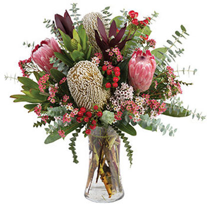 Beautiful Australian native vase arrangement makes the perfect long lasting gift. Native vase arrangement with mixed natives including proteas and leucadendrons.