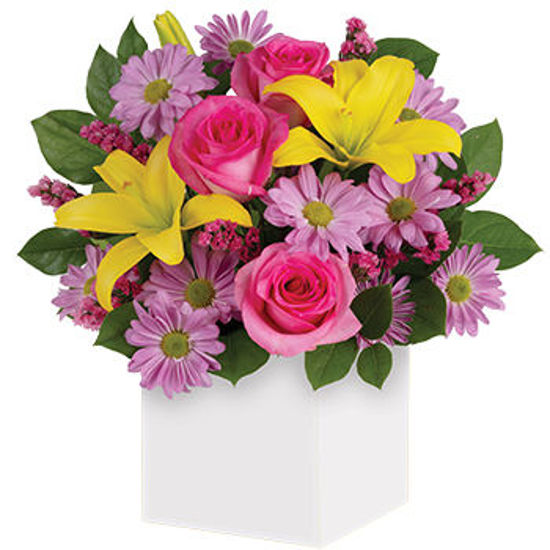 For any special occasion, there's nothing quite like the joy of receiving a surprise. And what better way to brighten someone's day than with a stunning box arrangement of pink roses, golden lilies, and lavender daisies? This beautiful combination of colours is guaranteed to bring a smile to anyone's face.